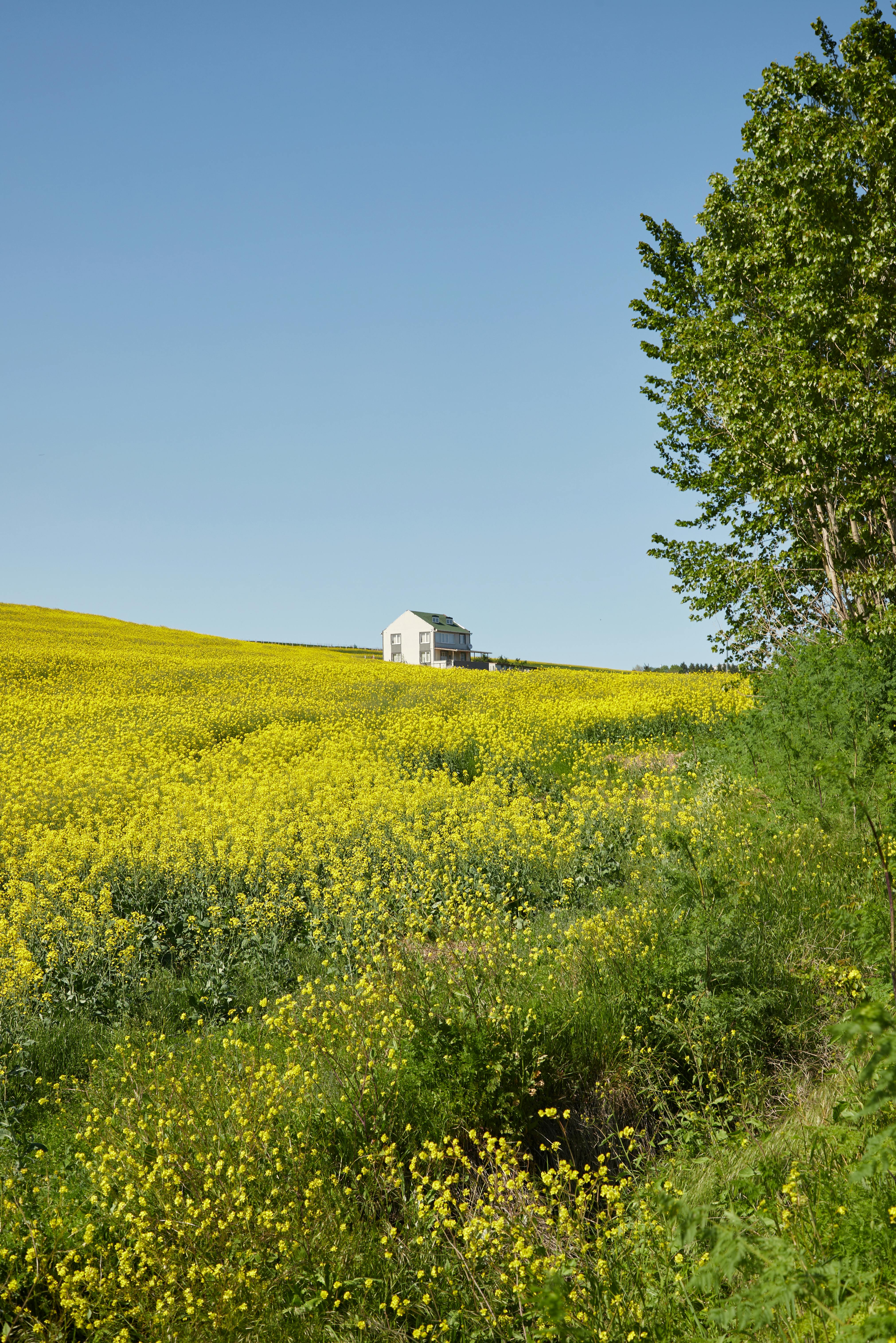 Charming rural house set within a vibrant yellow canola field under a clear blue sky.