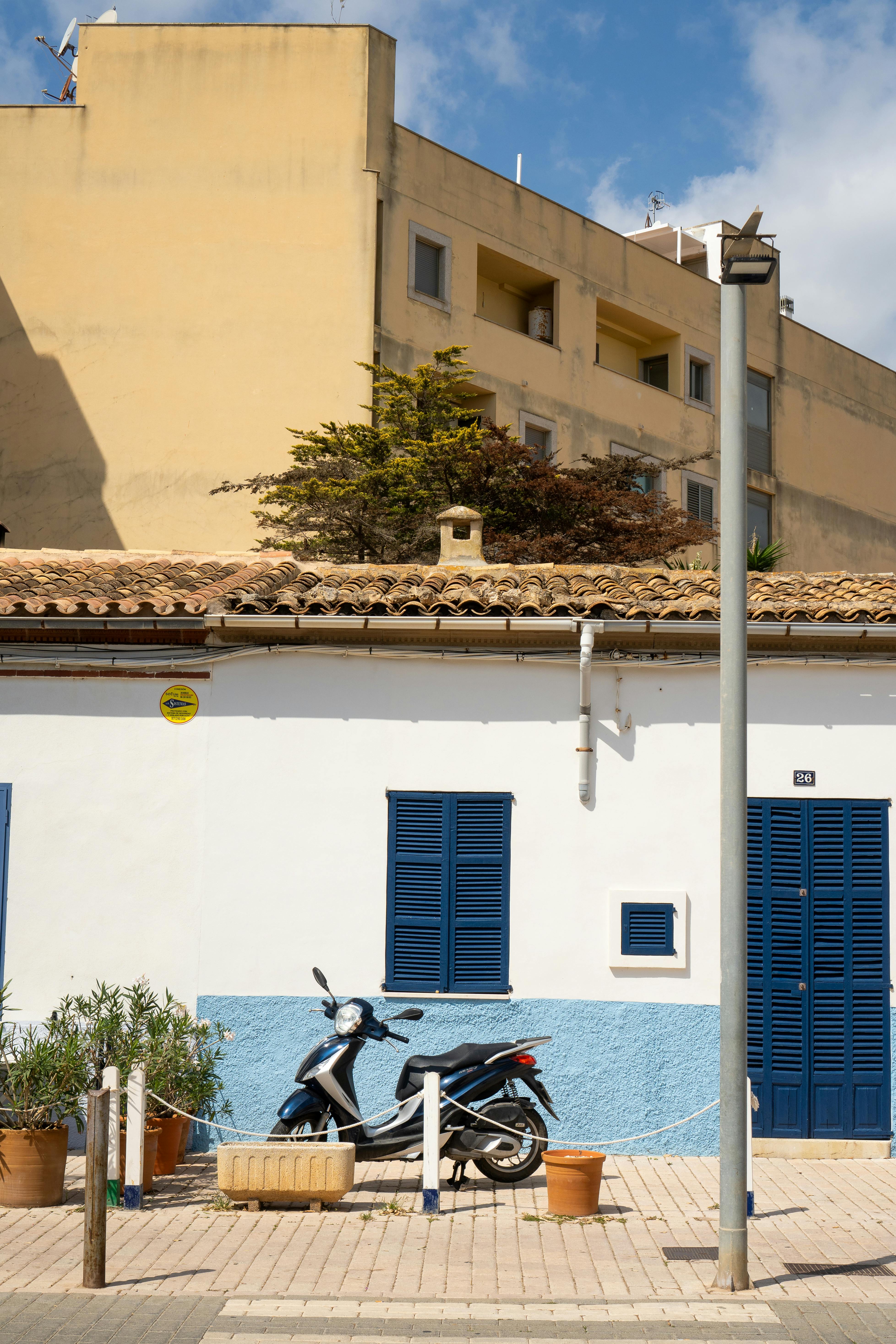Charming urban street scene with a scooter parked near colorful buildings with blue shutters.