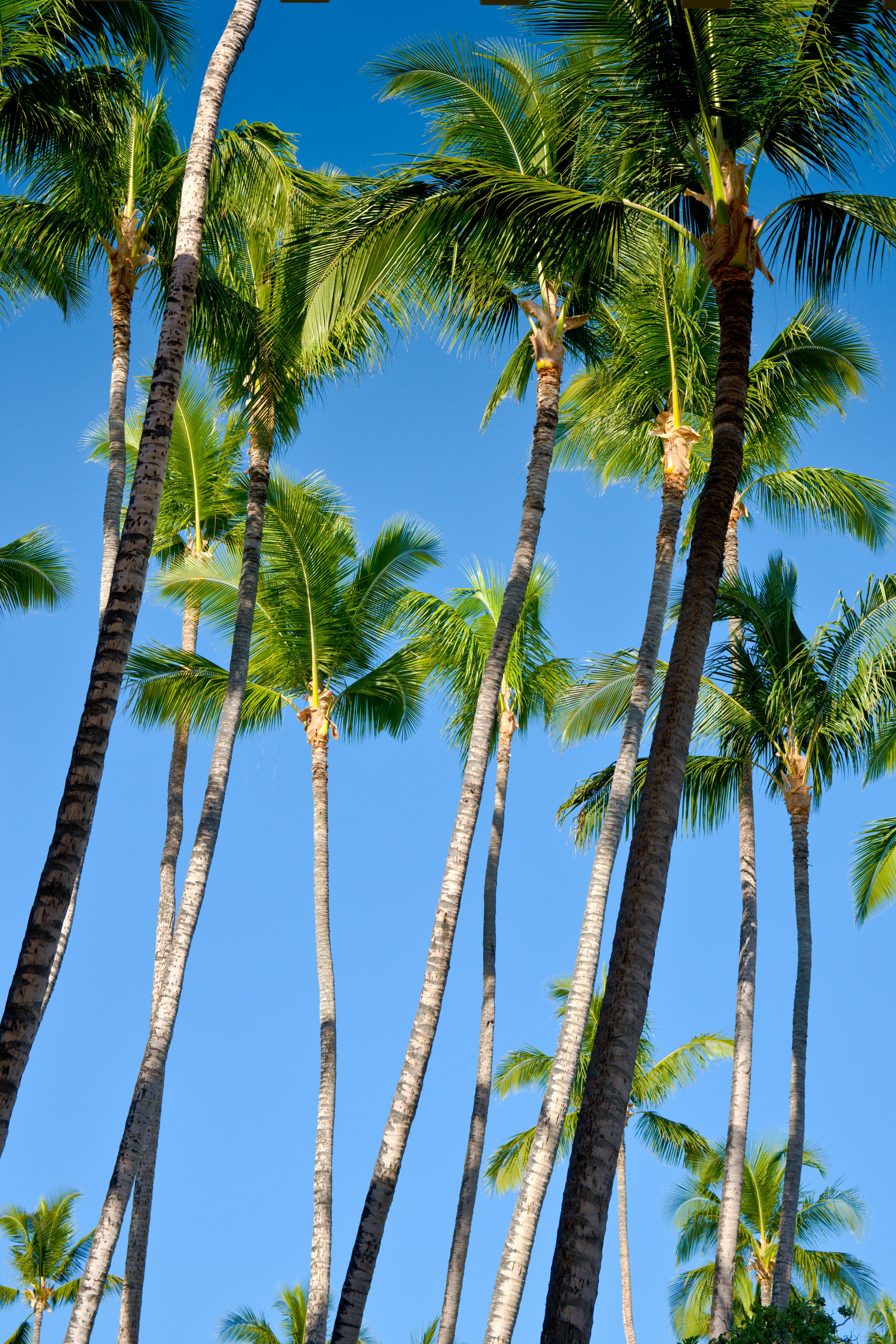 Vibrant palm trees reaching towards a clear blue sky, epitomizing tropical serenity.