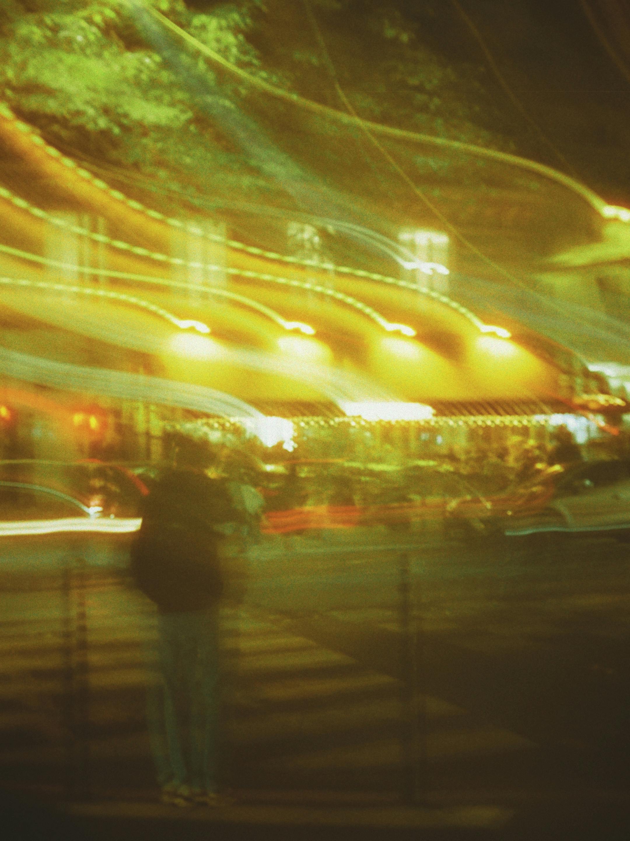 Captivating long exposure shot of a bustling city street with vibrant light trails.