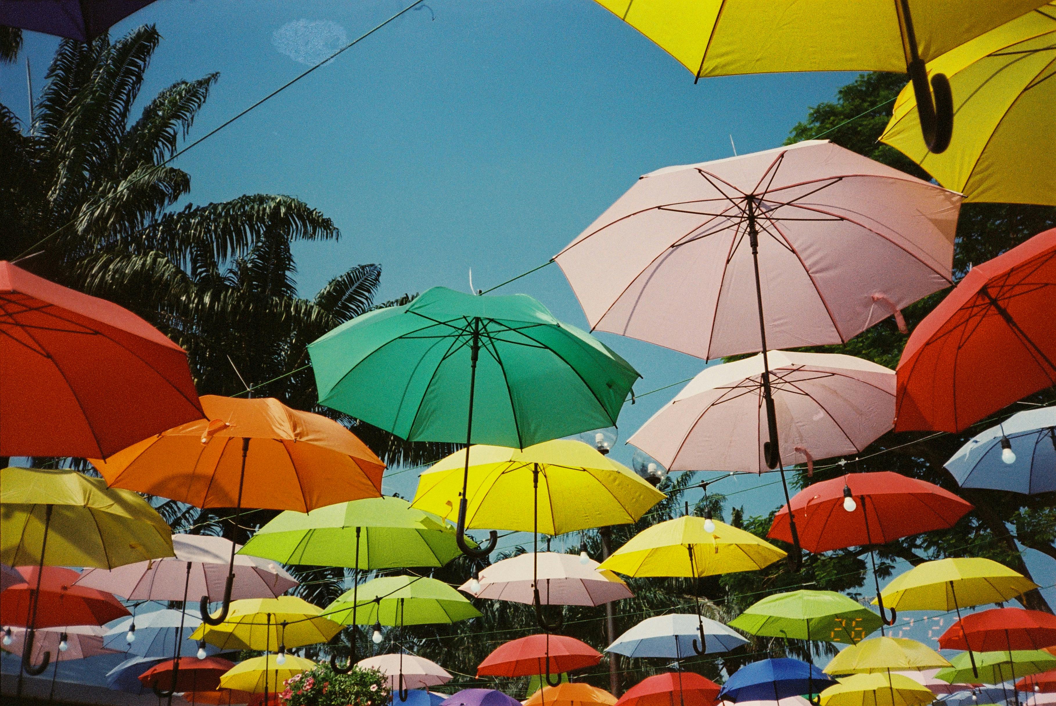 Vibrant umbrellas hanging outdoors with palm trees in the background.