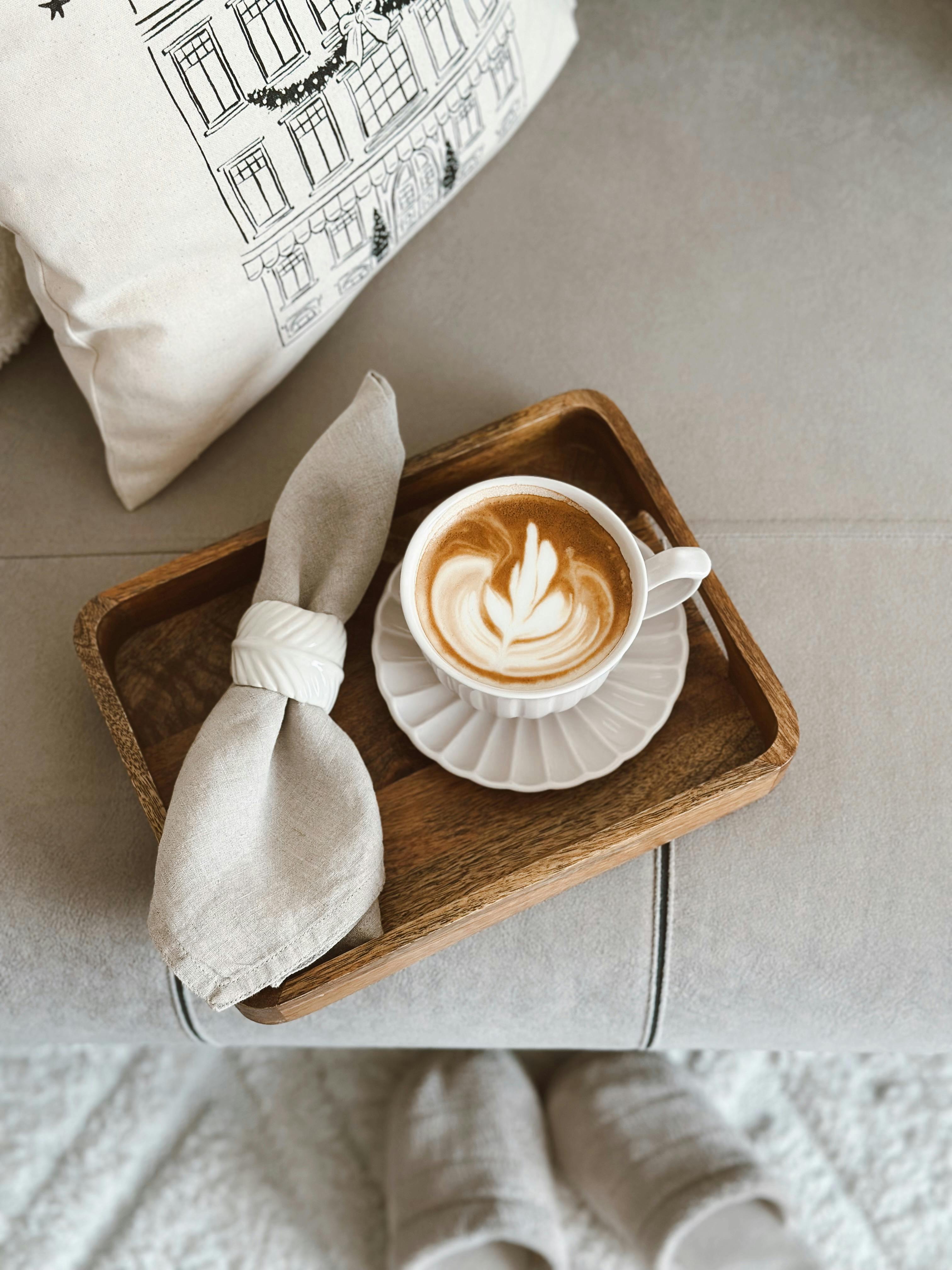 Cozy latte in wooden tray with napkin and pillow background, perfect for relaxing moments.