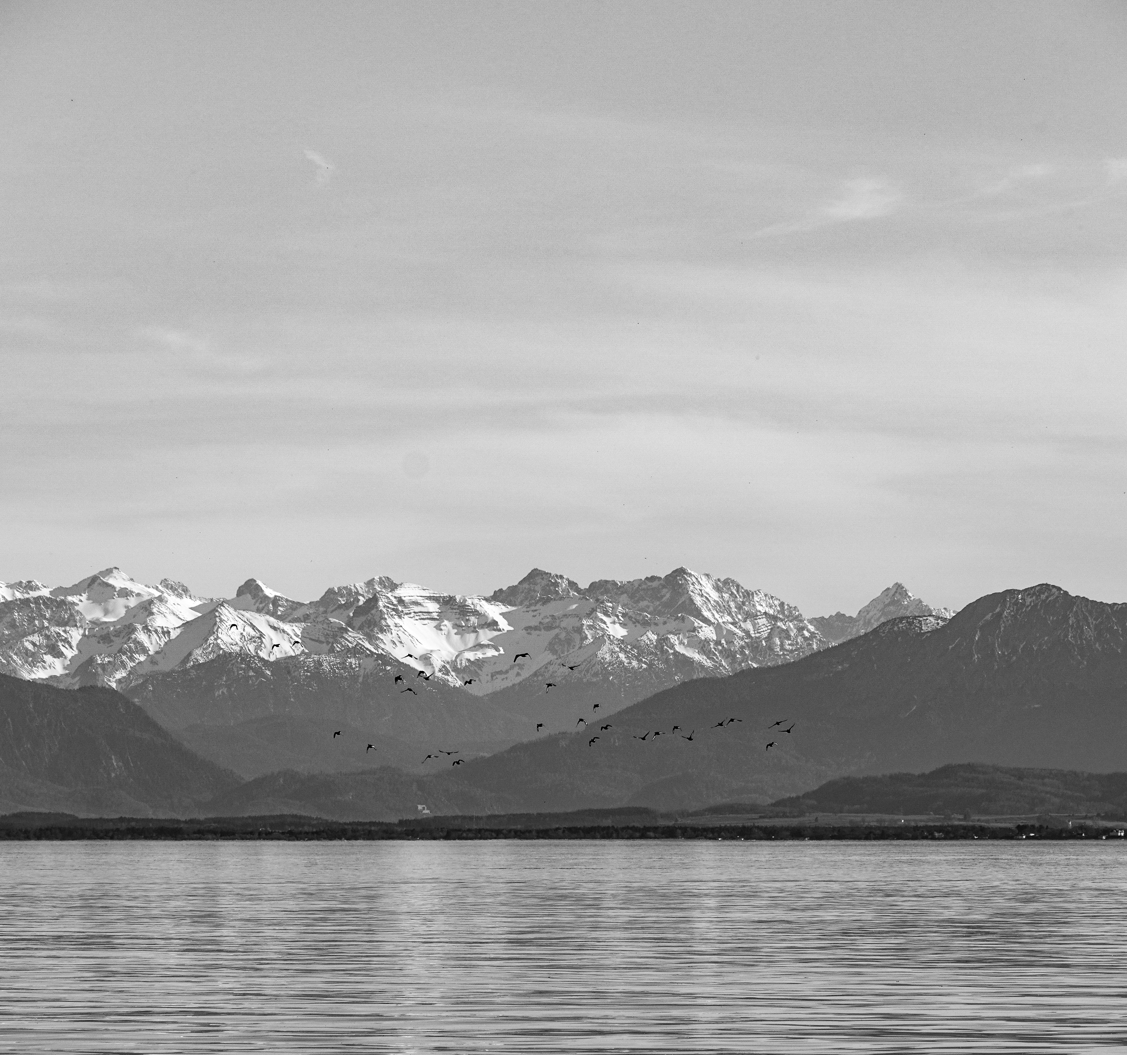 Stunning black and white photograph of Lake Starnberg with the Bavarian Alps in the background.