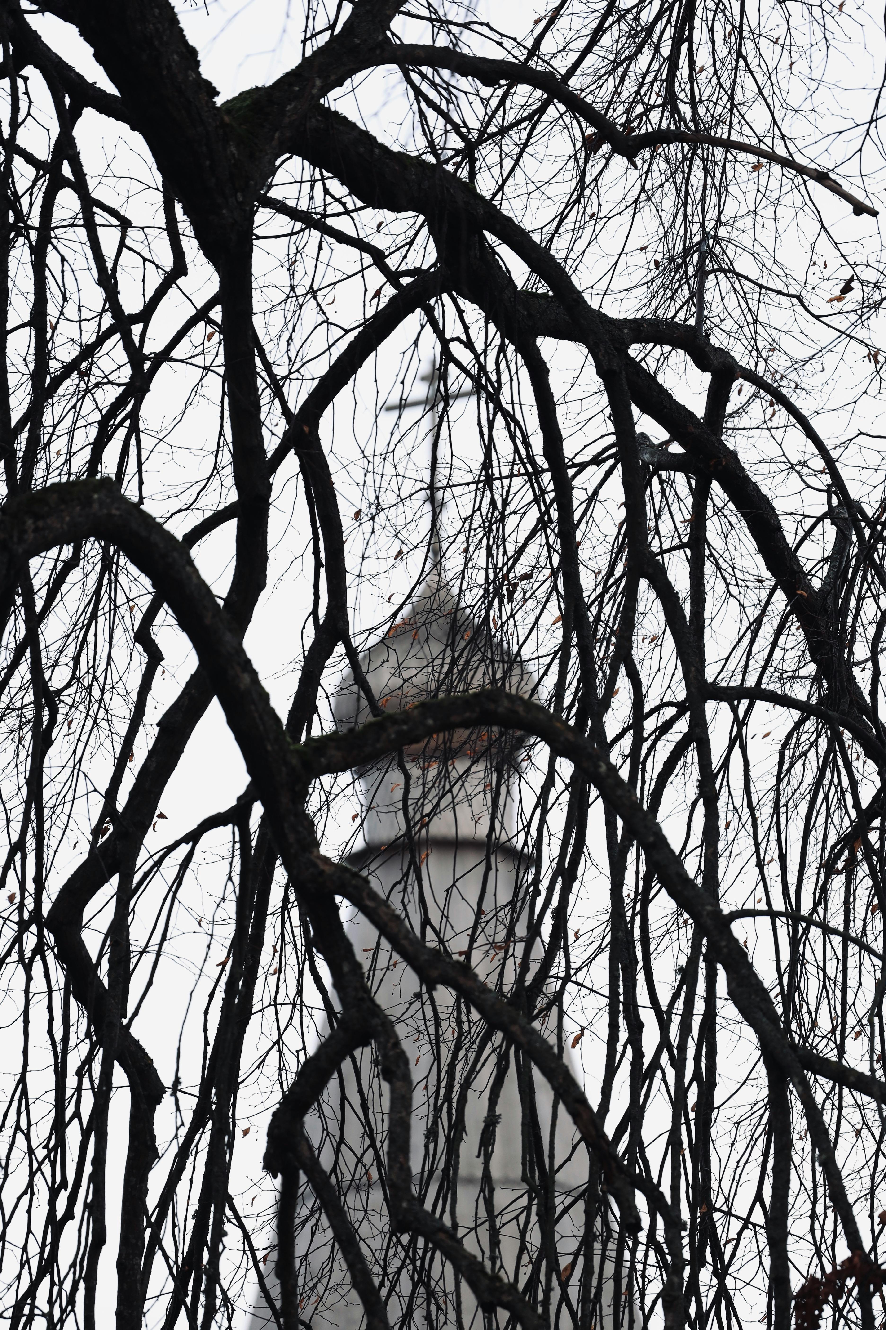 A Gothic church tower blurred in the background, framed by bare tree branches, creating a wintery and mysterious scene.
