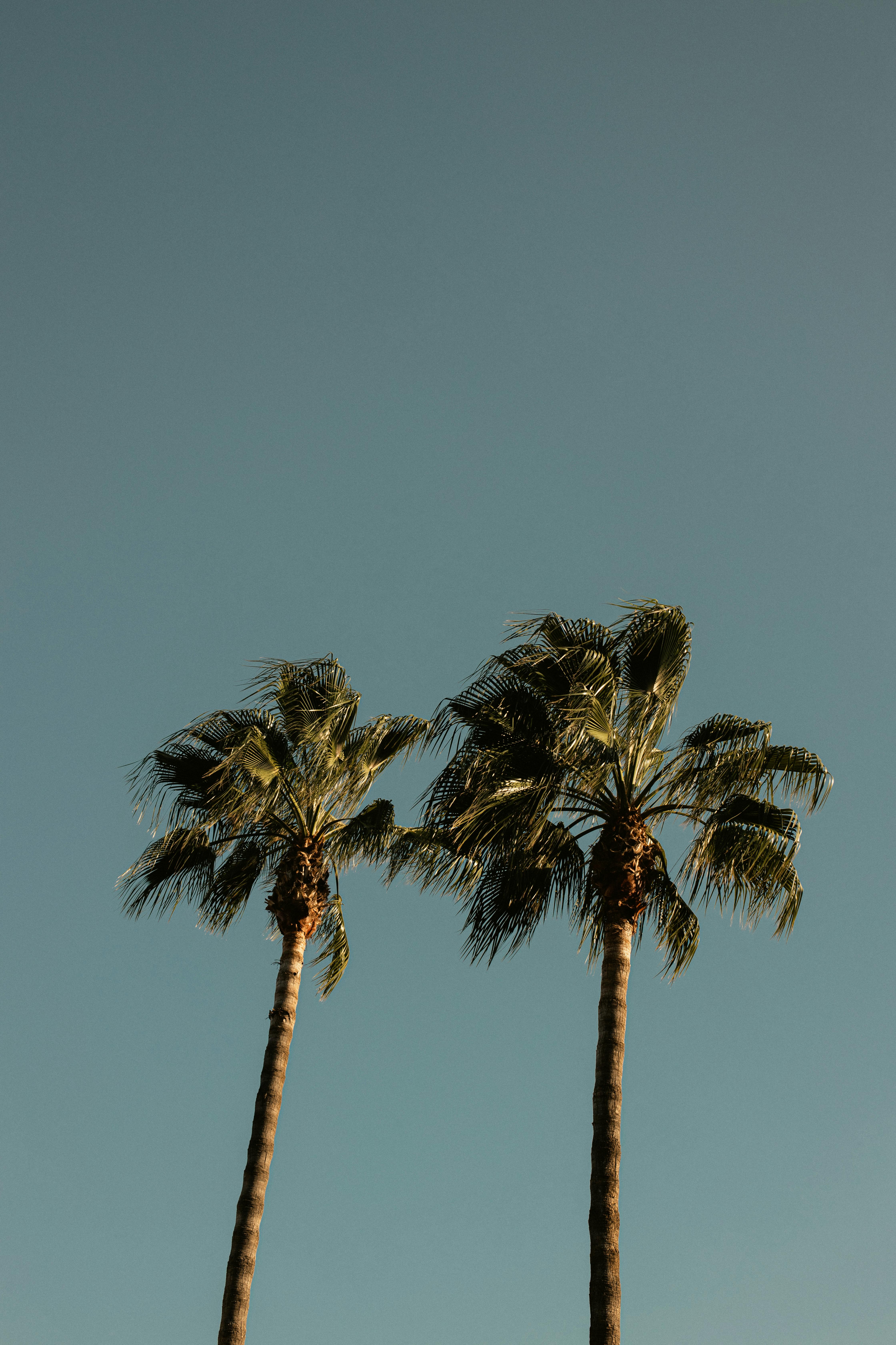 Two palm trees stand tall under a clear sky, evoking tropical tranquility.