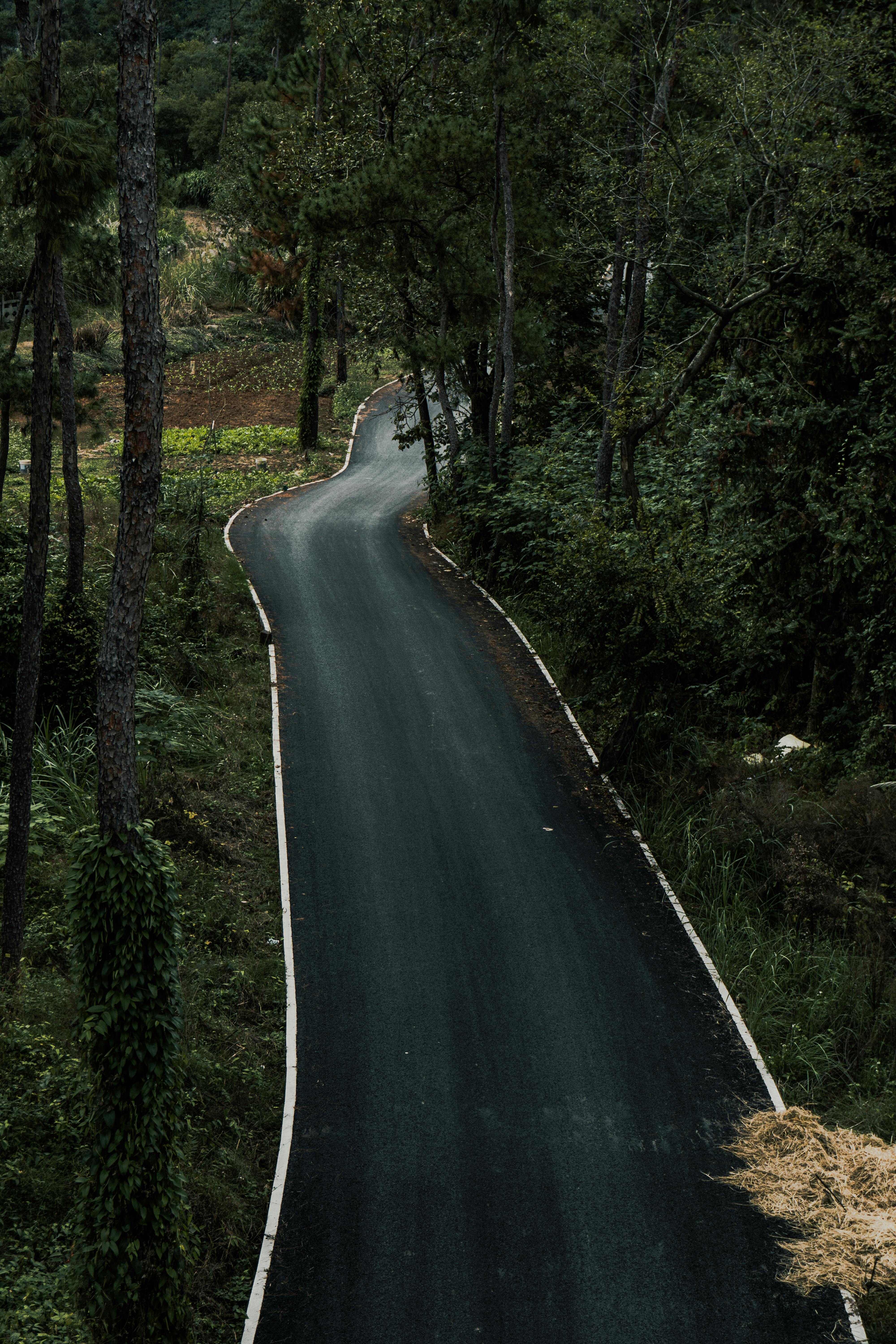 A winding paved road surrounded by dense forest, offering a serene nature scene.