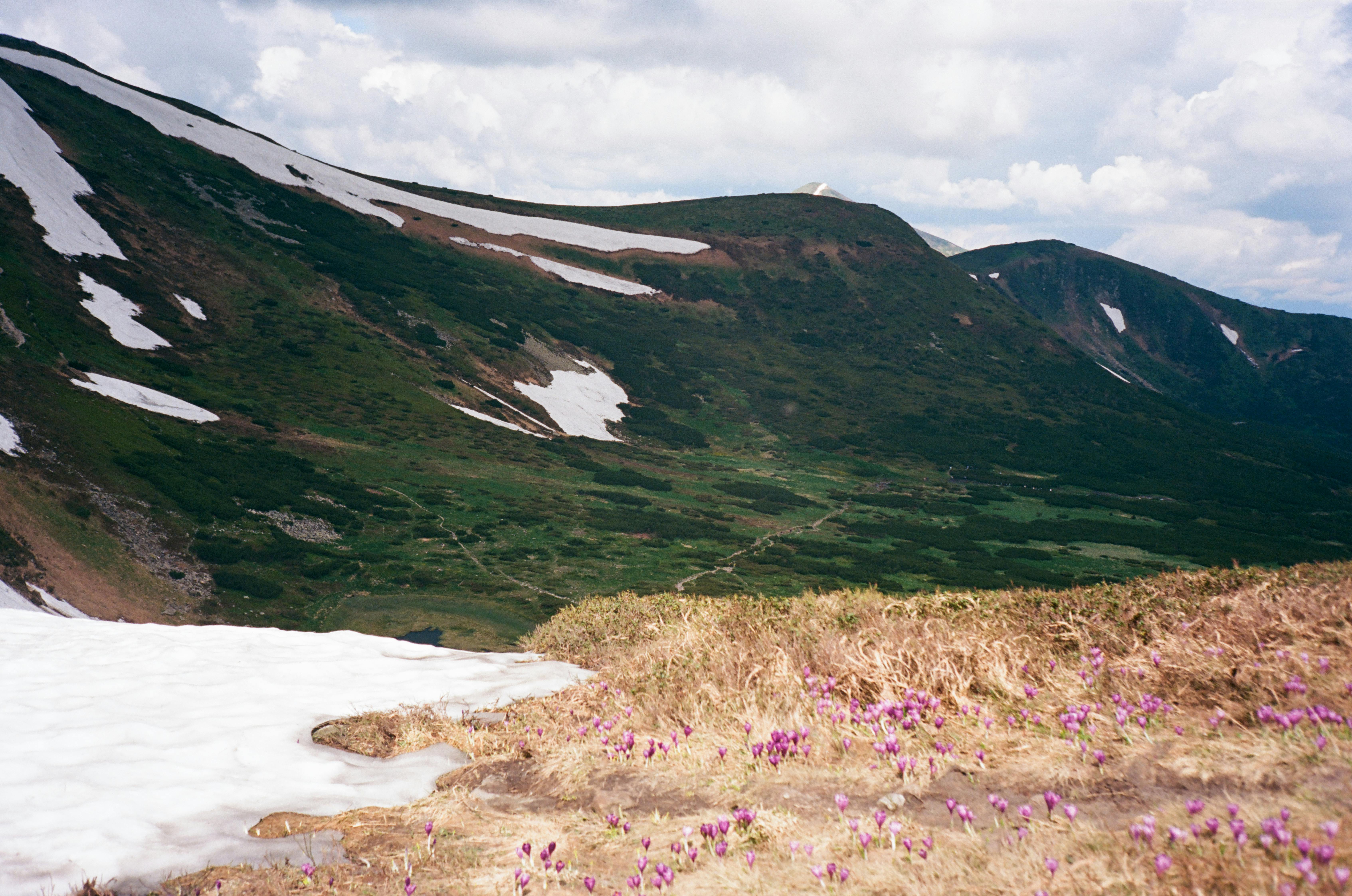 A stunning view of the Carpathian Mountains with patches of snow and purple flowers, under a bright summer sky.