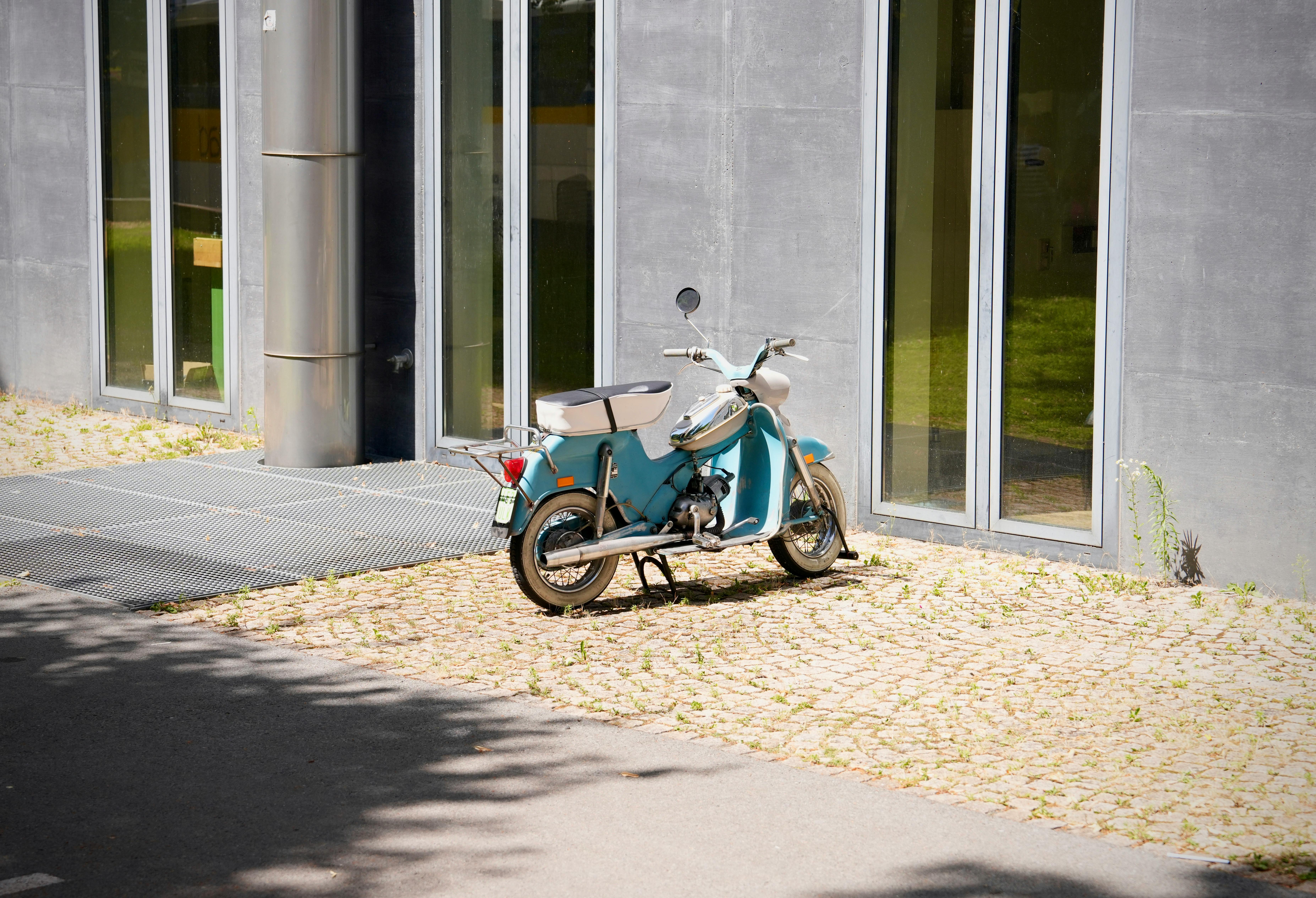 Retro blue scooter parked outside a modern glass building under sunlight.