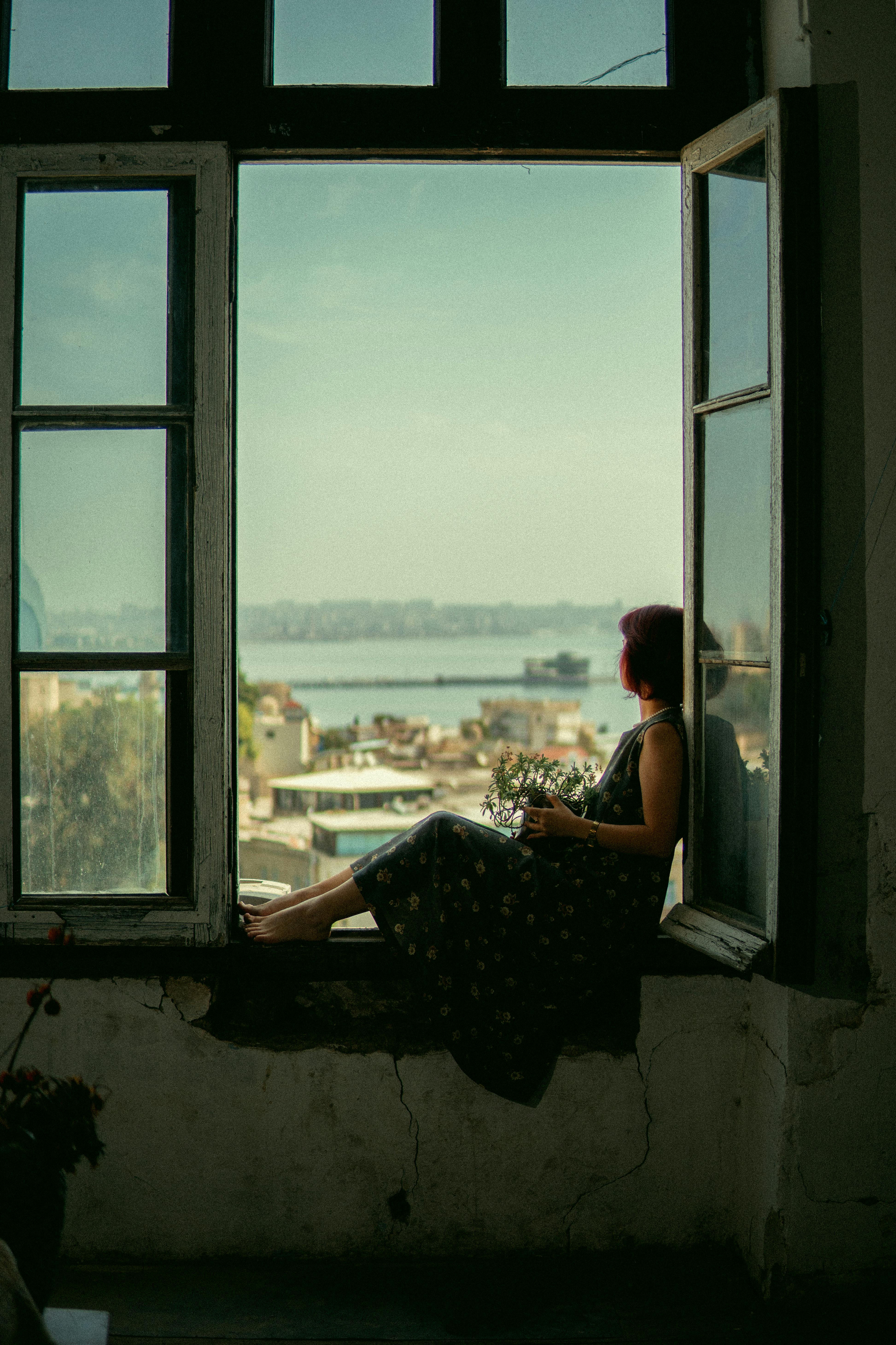 A woman sitting in a window, gazing at a scenic city view in Baku, Azerbaijan, with a serene mood.